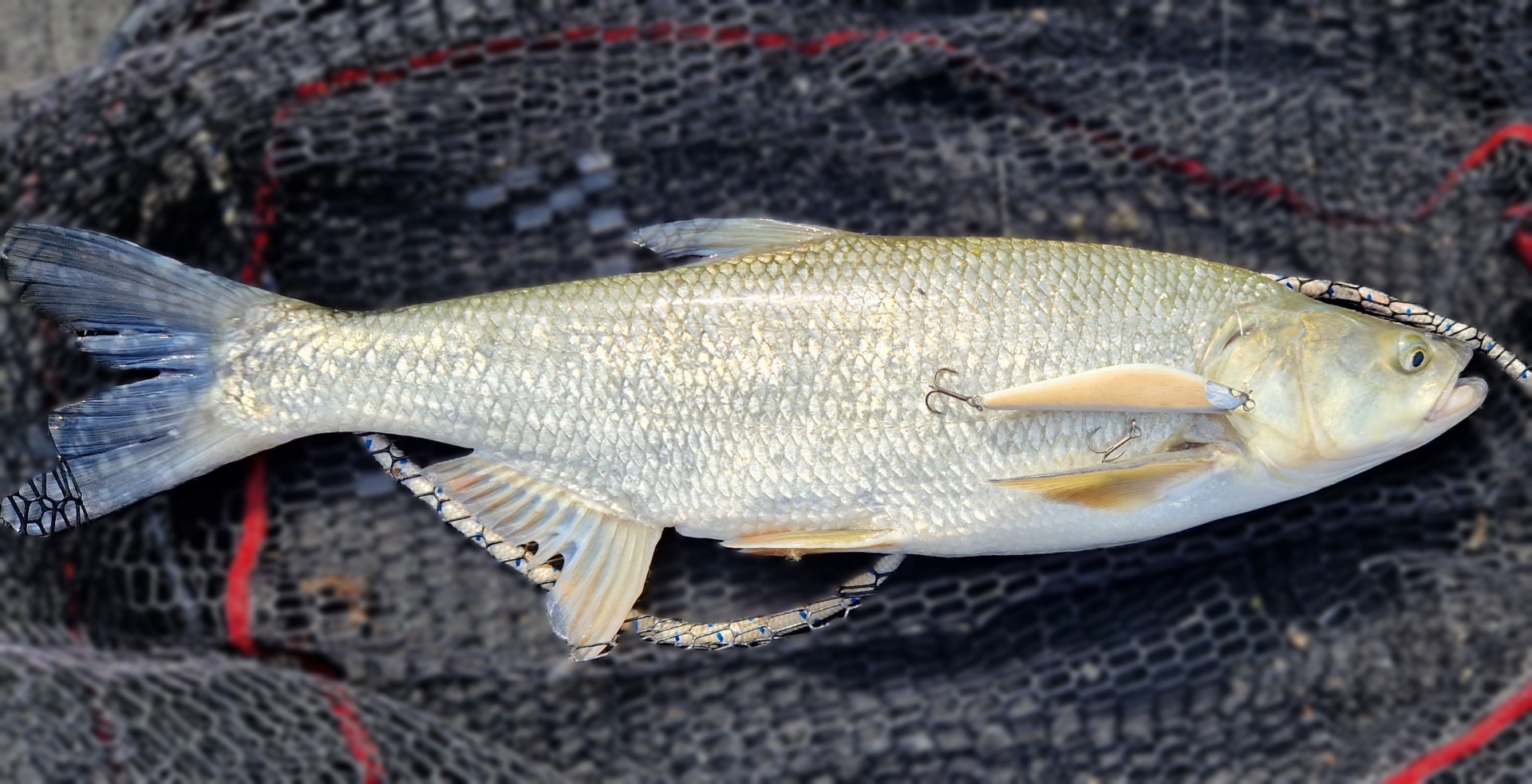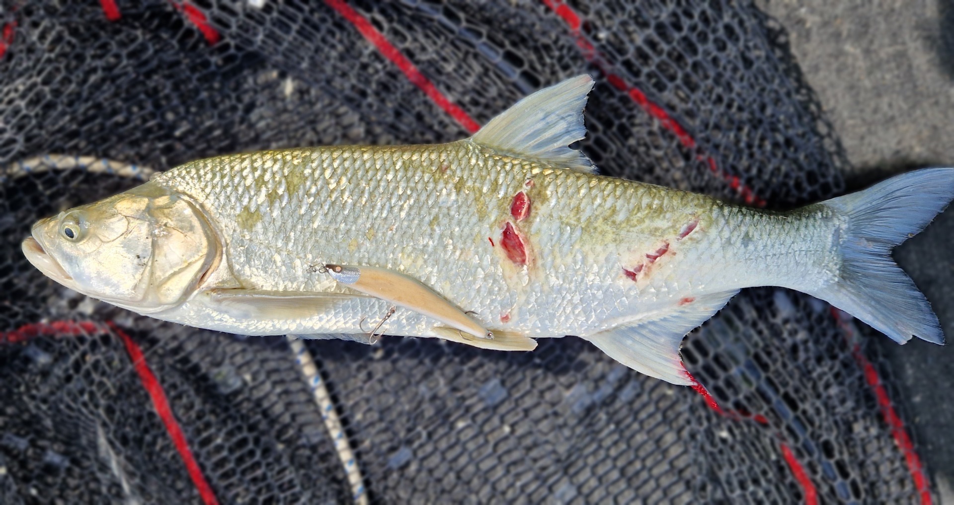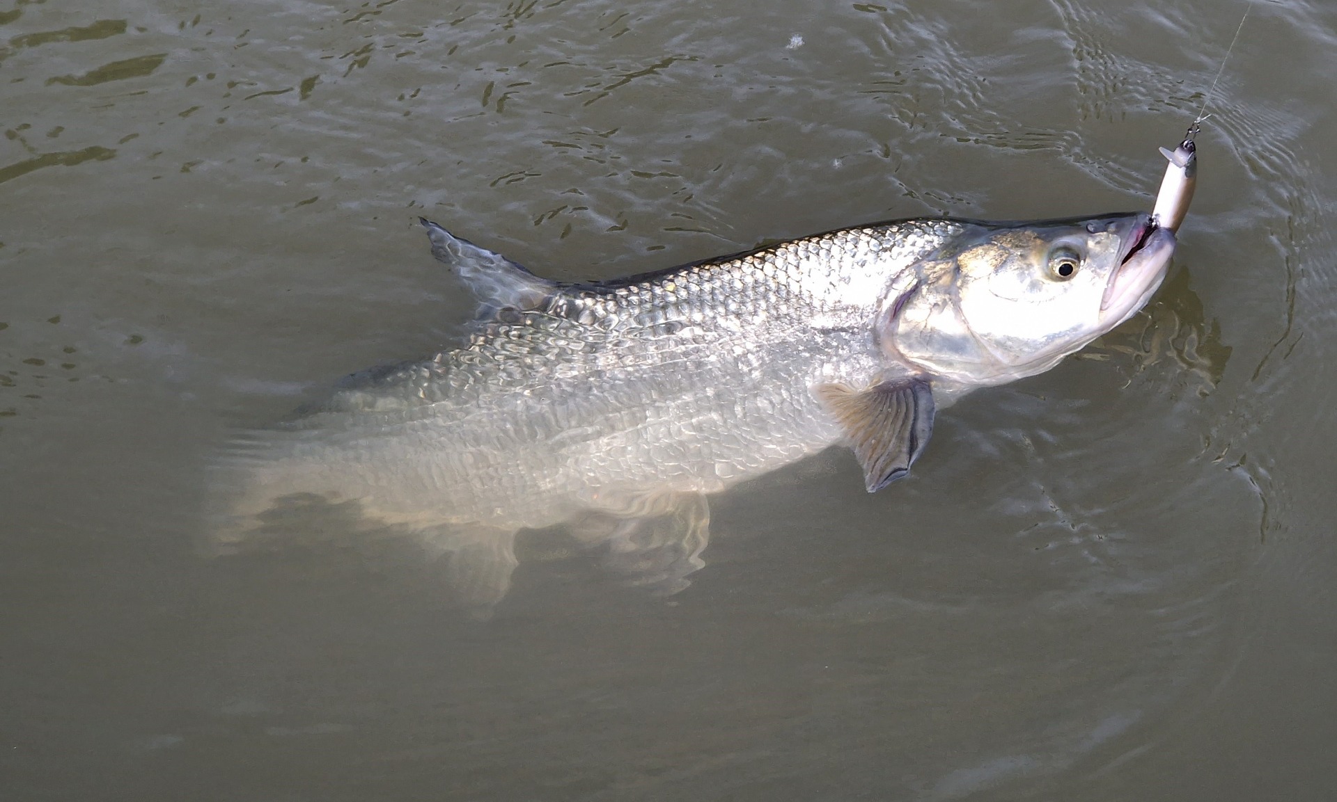Másnap reggel 5-kor már a kikötő parkolójába álltam be és gyors pakolást követően indultam is az előző nap helyszínére. Előző este szépen elterveztem, hogy milyen csalival, hogyan fogok horgászni a fröcskölő fenekeszegekre, de a csatorna bedőlt fájához érve szomorúan vettem tudomásul, hogy a balinok nem jöttek el a randira. Horgonyzás után 10 percig figyeltem a vizet, de rablásnak nyoma sem volt. Ez így nem lesz jó, hol vannak az őnök? Mindegy, ha már itt vagyok, dobjunk egyet. A kapocsba Tomi barátom akkor még tesztelési fázisban lévő Fürkésze került, amit alkotója úgy adott a kezembe, hogy nagy süllőket fogok vele fogni. Cimborám akkor még nem sejtette, hogy én nem foglalkozom efféle gyártói "rendelkezésekkel", és holmi gyüttment balinoknak fogom felkínálni az igen míves darabot. Egy alsó lendítés csuklóból és a fahalacska 15 méterrel a bedőlt fa felett érkezett a vízbe. A 6.1-es áttételű orsót is búgócsiga sebeséggel kellett hajtanom, hogy a csatornában felém száguldó vízben wobblerem életre kelljen és elkezdjen veretni. A következő dobást már sokkal messzebbre hajítom, hogy legyen időm felvenni a kontaktot a csalival és a fa előtt, már megfelelő tempóban húzzam Fürkészt. Az első negyedóra kapás nélkül telik, viszont elkezdenek rabolni a balinok a felszínen. Próbálom csalimat minél közelebb vezetni az elvágó víz határához, mely próbálkozás meghozza a kívánt sikert. Az ütés pillanatában a hal csaknem kicsavarja a botot a kezemből. Bevágni sem kell, a csali sebessége és a hal kapása kellő akadást biztosít a horognak. Az erős sodrás és a lendületben lévő balin feladja a leckét a szerelékemnek. A 4-21g-os Dragon nyélből hajlik az orsó pedig erősen felsírva próbálja meg kidolgozni halam kitöréseit. A merítőt persze elfelejtettem összerakni! A fene! Akarom mondani a fenekeszeg kezdett fáradni, így volt időm pár fotót csinálni róla a víz színén. A horog nem is a szájába, hanem kívülről, a feje tetejébe akadt. Halamat gyorsan a hajó mellé kormányzom és egy rutinos mozdulattal kiakasztom horgot.