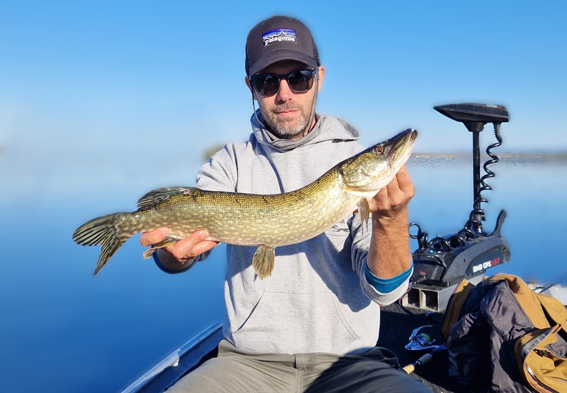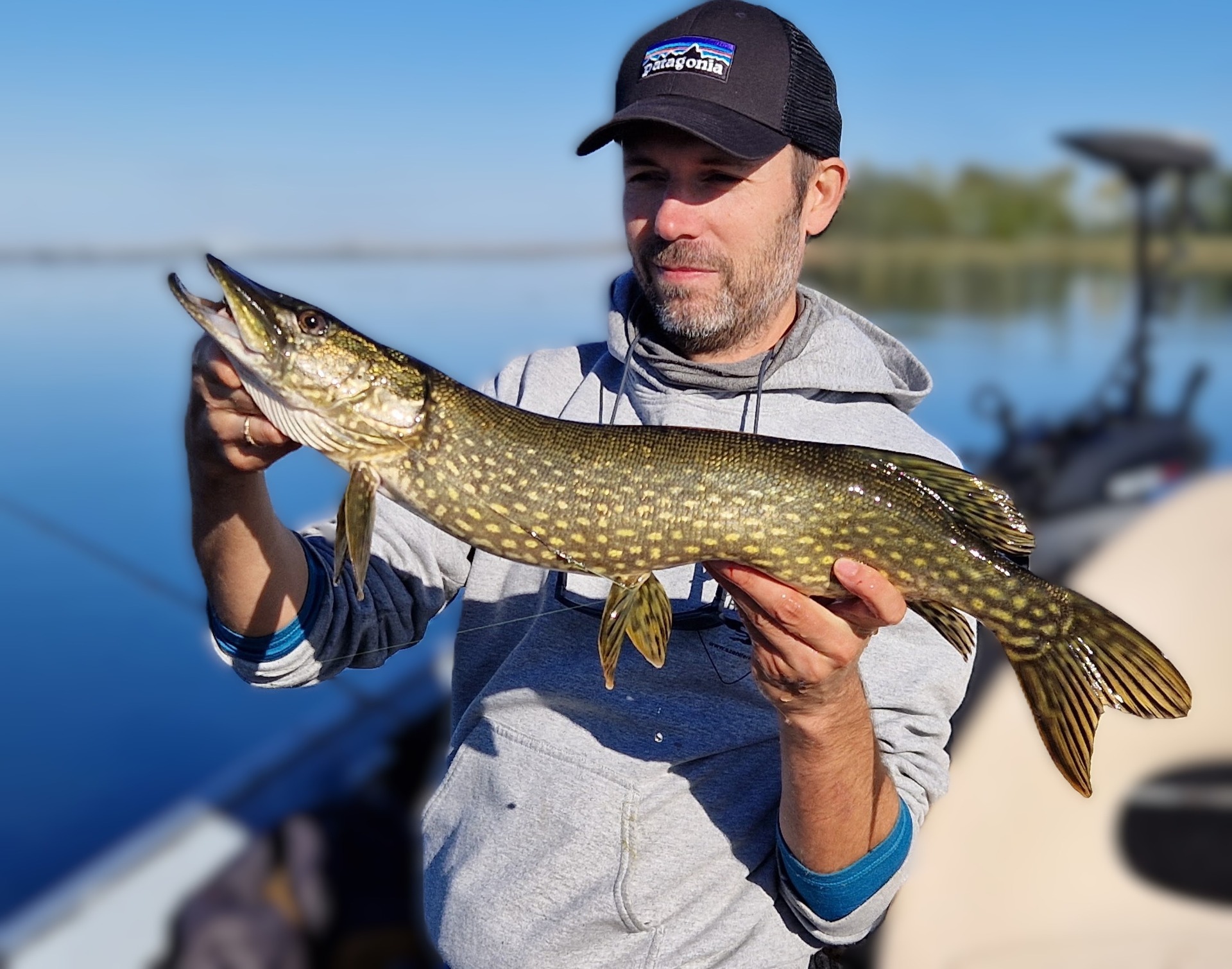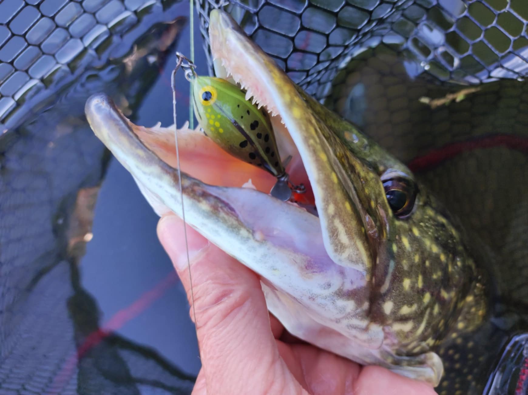 Alig telt el 10 perc, amikor újra akcióba léptem. Egy 4-es Mepps körforgóval próbálkoztam, és hamarosan egy erőteljes kapás rázta meg a botomat. Az adrenalin ismét az egekbe szökött. A hal keményen küzdött: lemerült, oldalra tört, a vízből kiugorva rázta a fejét, de a felszerelés bírta a strapát, és néhány perces harc után sikerült a szákba terelni. Egy újabb szép csuka került a fotótárba, az előzőhöz nagyon hasonló méretben.