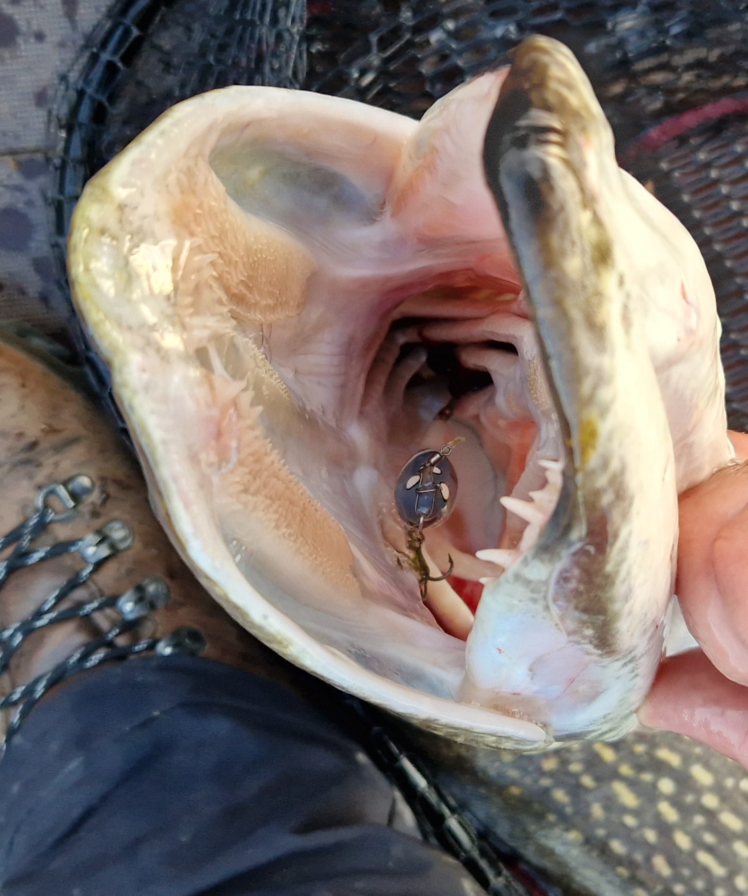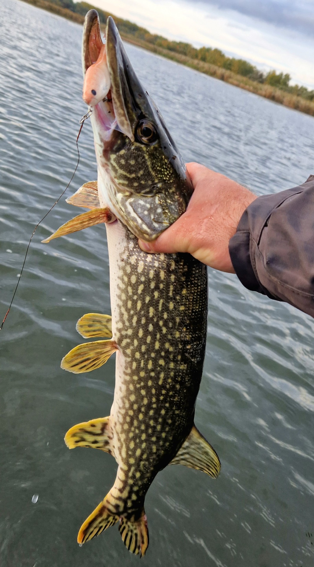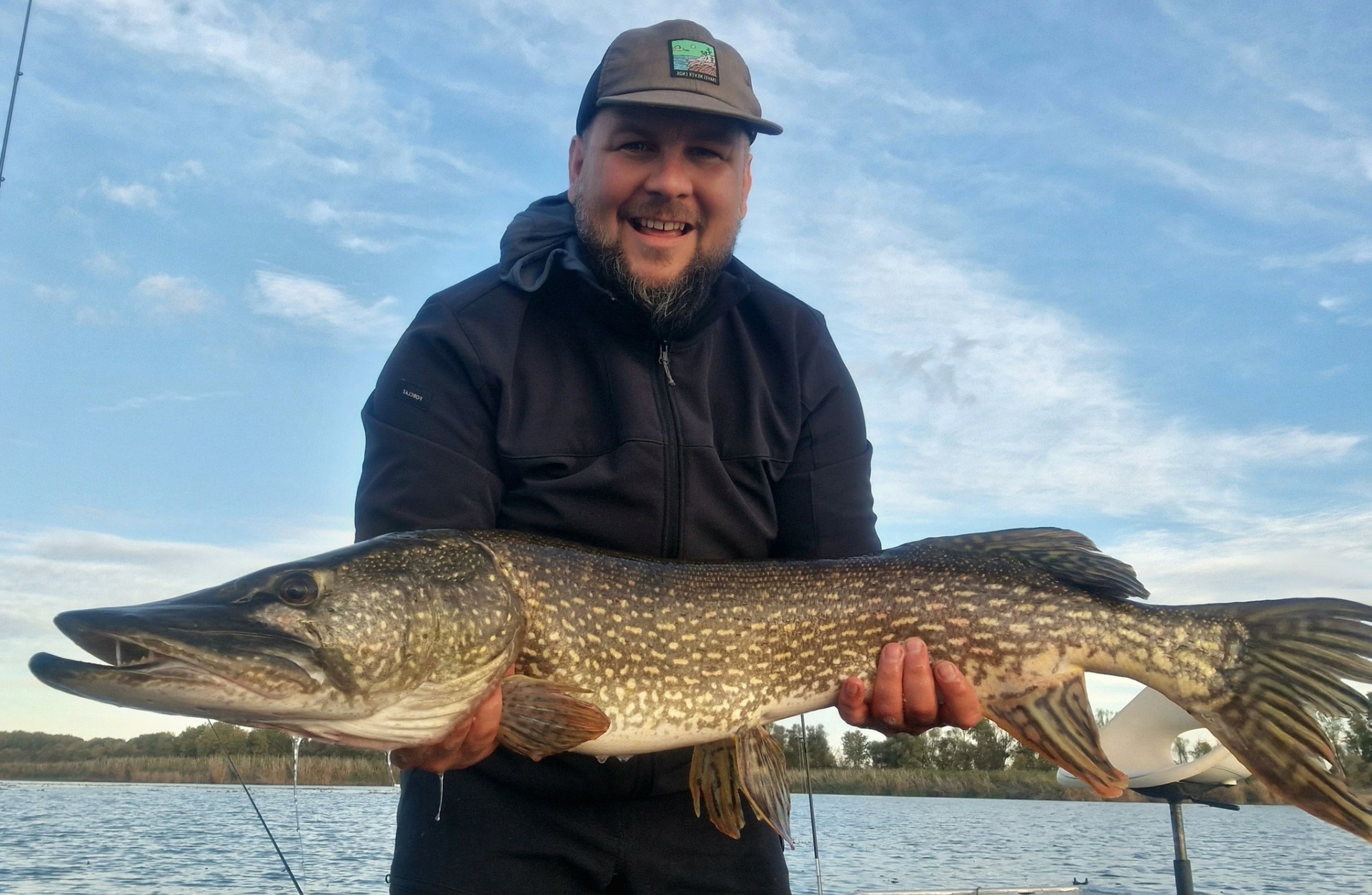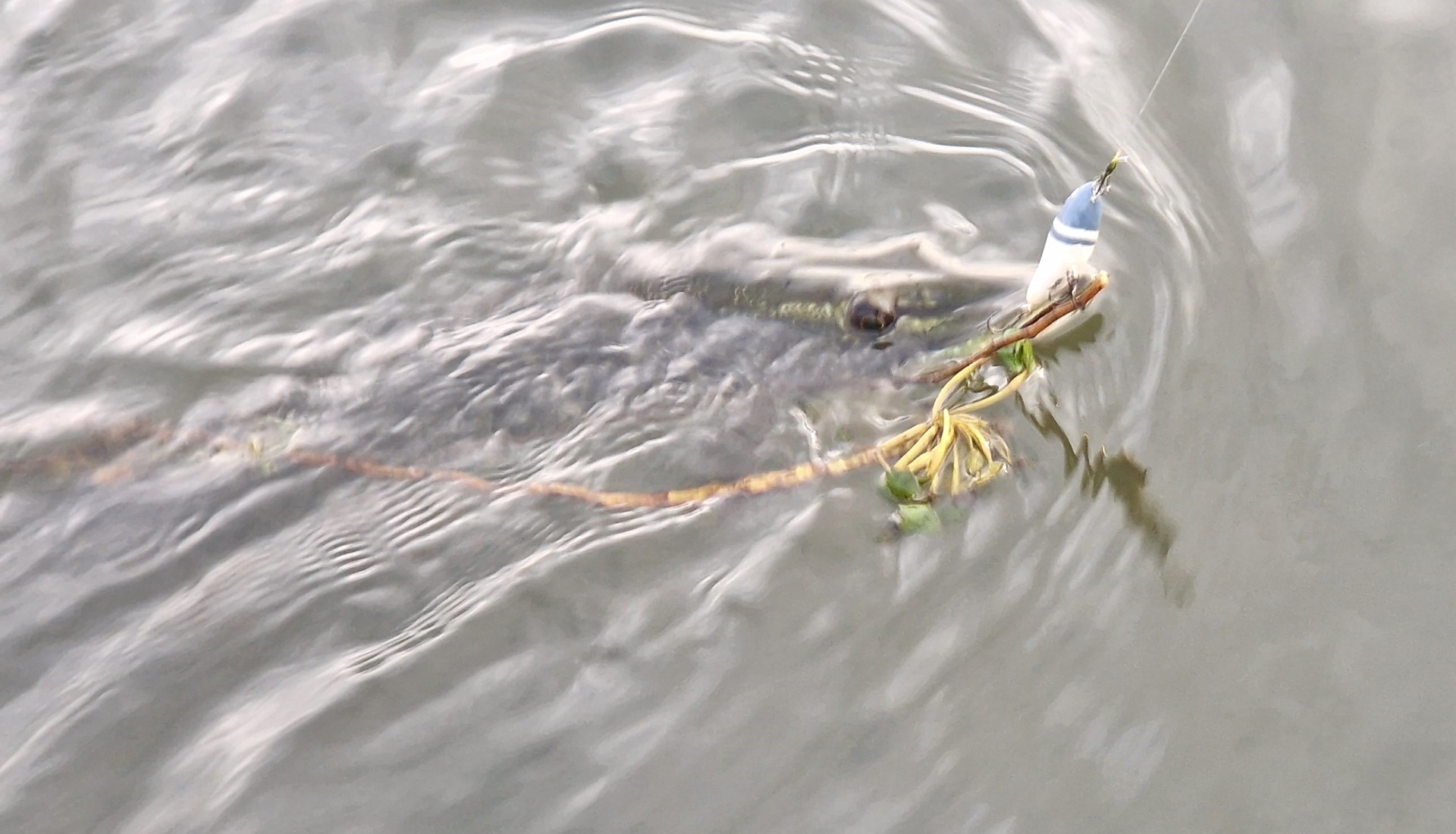 Nincs idő tovább búslakodni, a víz kezd kisimulni és a fények is kiválóak. Nyitom a halbogaras dobozom és az első kezembe kerülő husi színű Vergőt teszem a lágyabb bot kapcsába, nincs idő újra kötni a másikat. A következő dobások eredménytelenül telnek, a szél pedig elkezdett újra erőre kapni így Vergő is csak vergődik a hullámok hátán. Nagyon hiányzol skipper. Hoppá, tőlem balra úgy 20 méterre egy balinrablás. Gyorsan kitekerem Husit és már dobom is a rablás irányába. Alig kezd vergődni a csali, amikor hatalmas fröccsenéssel jelentkezik az érdeklődő, de elvéti. Két pöccintés a csalin és már durrantja is le a balin. Szokásos magasra emelt bottal kezdem meg a fárasztást, de elég furán védekezik ez a balin. Semmi kirohanás, semmi rúgás, csak némi elnehezedés és folyamatos ellenállás. Közelebb érve látom, hogy némi hínárral megfűszerezve egy a korábbiaknál kisebb csuka érkezik meg a hajó mellé. Pedig szentül meg voltam győződve, hogy balin lesz a tettes. Na mindegy…! Dobálgatok, próbálkozom Vergő vezetésével a hullámzó vízen, nem akad újabb jelentkező. Átállok, hátha egy nagyobb tökleveles mellett lesz valaki, aki érdeklődést mutat Husi iránt. Így is lett, talán a második dobásra sikerült kitekerni egy 60cm közeli csukát.