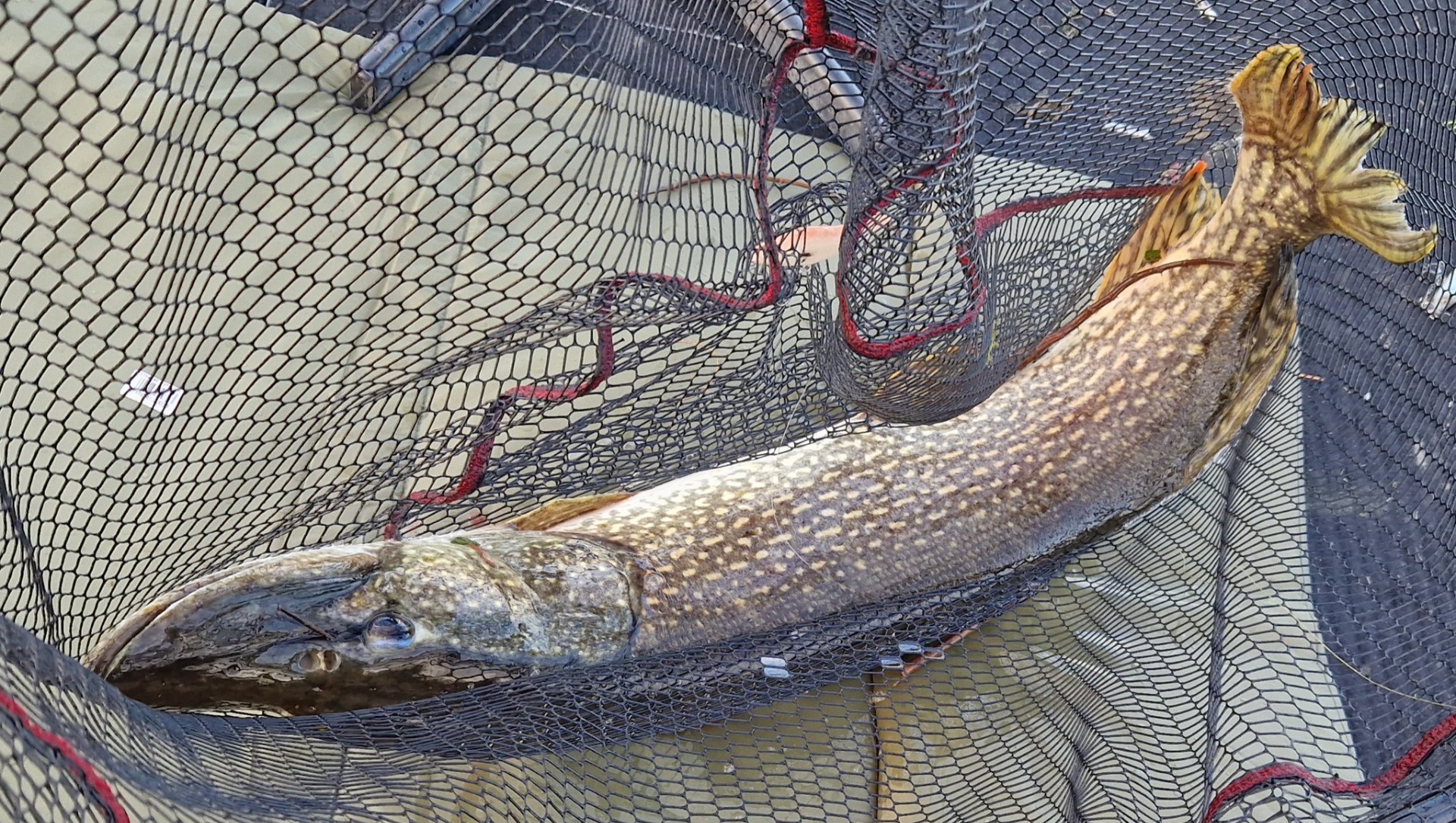 Dobálok tovább, de nincs sok eredménye, a tiszta, nyugodt víz és a napsütés nem jó kombó csukára. Már pont azon töprengek, hogy odébb állok, amikor a kubik végében rablásra leszek figyelmes. Odanavigálom a csónakot, de a dobások nem adnak halat. Még közelebb megyek, már csak a szél sodor. Az egyik gyékényfalban van egy kiöblösödés. Vergőt egy alsó pöccintéssel sikerül is oda ejtenem. Ahogy ide-ode cikázva közeledik felém a gyékényből tolóhullám kezdi el követni, majd a víz elkezd megemelkedni. Megállítom Vergőt, a hullám is megáll. Pici pöcc és Bumm. Megvagy! Hatalmas erővel indulna vissza a gyékénybe, de nem engedem, a bot karikába hajlik, az orsó is halkan engedi a zsinórt. Szerencsére a növényzet előtt sikerül visszafordítani a halat. A vízből kiugorva és a fejét rázva adja értésemre, hogy ez bizony nem tetszik neki. Még pár kirohanás, de gyorsan a merítőben pihen egy gyönyörű sötétzöld, 64cm-es csuka. A hely nem ad már több halat, nem csoda, nagy bulit csaptunk az imént. Átállok a kubik másik végébe, ahonnan egy újabb 40 plusszos csukeszt operálok ki Vergővel.