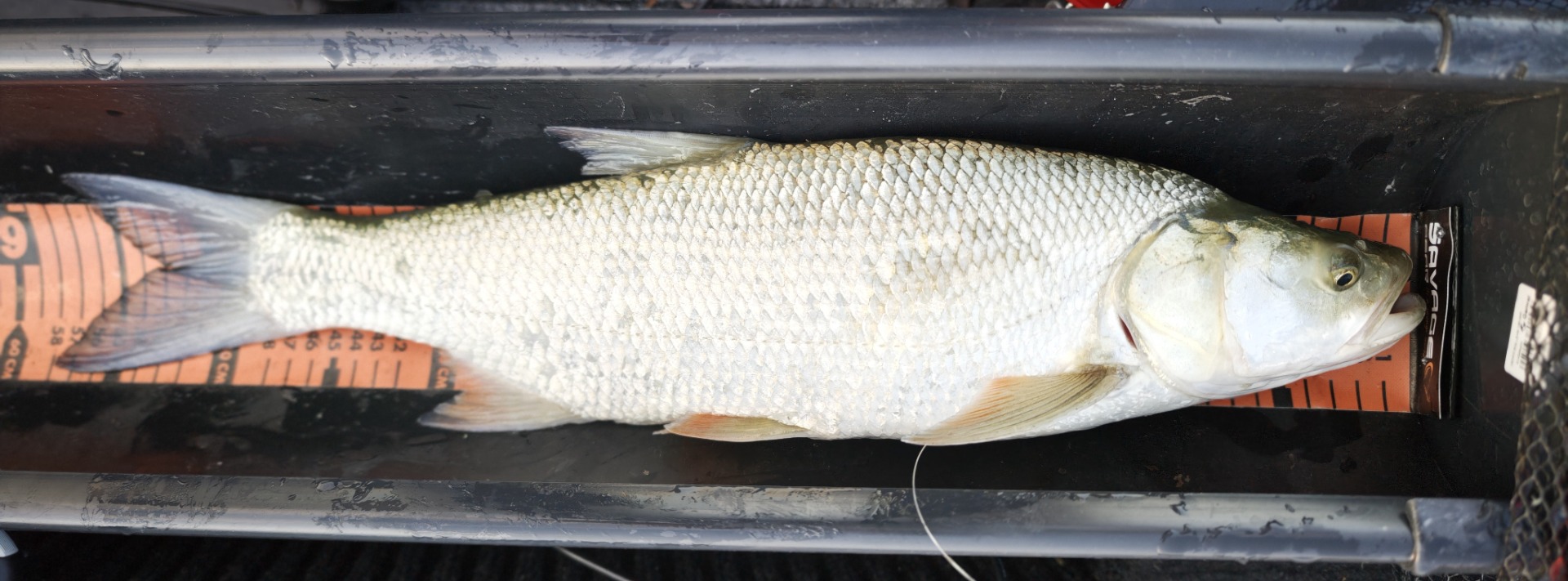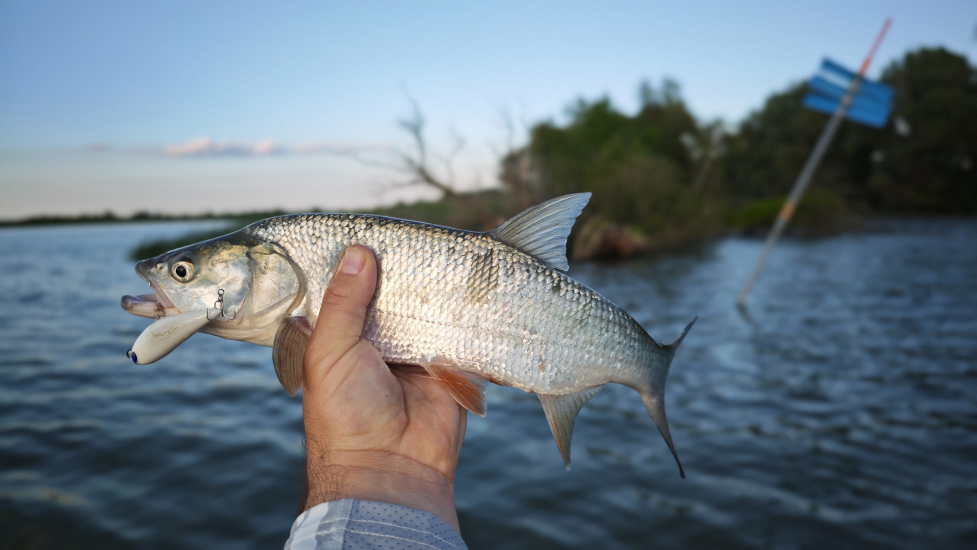 6 óra körül értem ki a folyóra, gyorsan le is csorogtam a tegnapi helyemre. Másodiknak értem a spotra, egy bakcsó már vígan falatozott a küszökből a balinok mellett. Nem konkurencia – elférünk. Az első dobás a partszéltől fél méterre landolt – jó, hát az első dobás mindig a távolság felmérését szolgálja. De a második dobás a növények leveleit súrolva ért vizet. Az első hajtókarfordítás után máris vendégem hozta vissza a csalit. Gyors fotó, mérés, visszaengedés. Következő dobás – bumm! Szerintem még vizet sem ért a csali, a balin kiugrott érte a levegőbe. Jó, ez persze némi túlzás, de tuti a szájába dobtam. Újabb dobás – ez picit hosszú lett, de a parti növényekről lepöccintett Rapalának így is akadt jelentkezője.